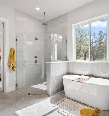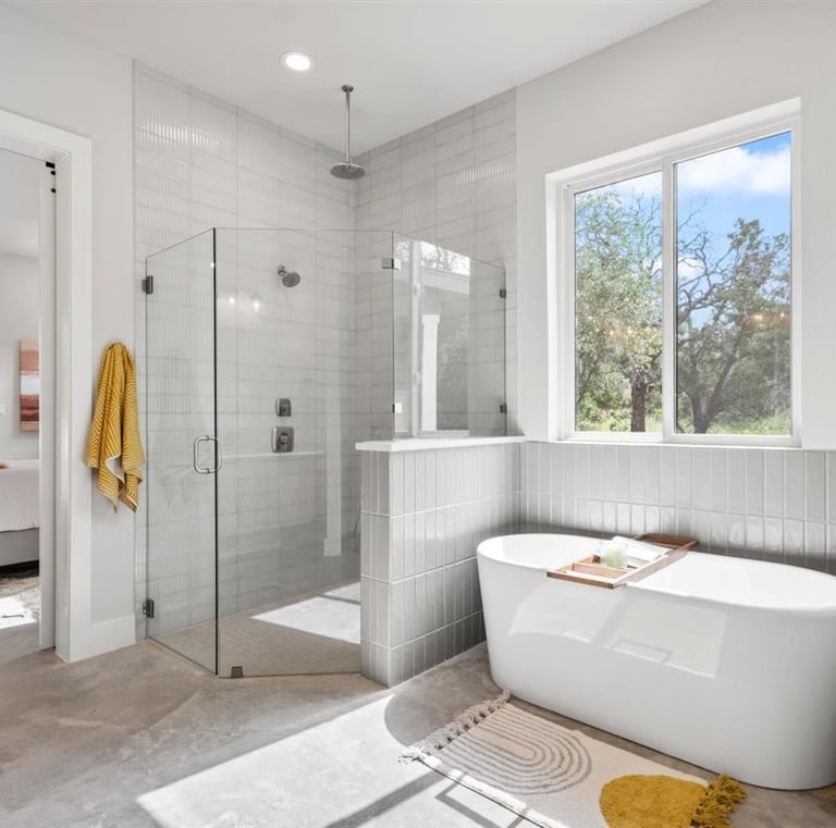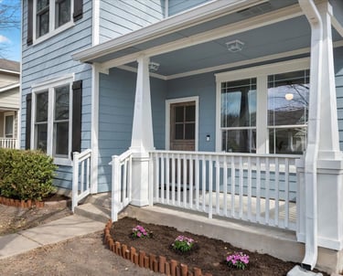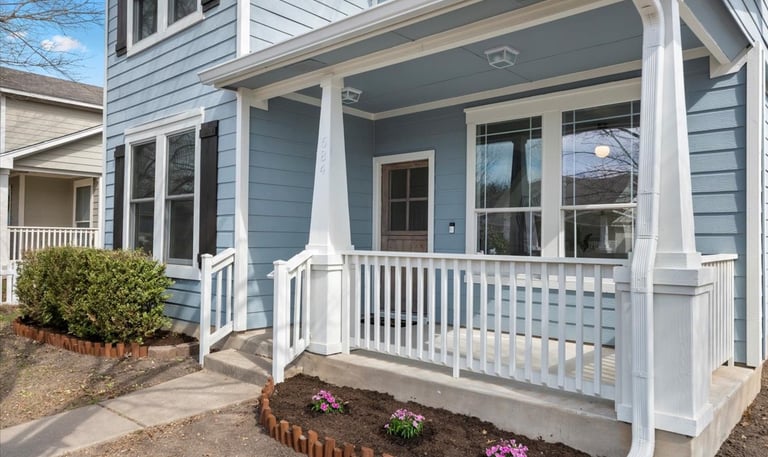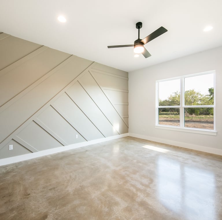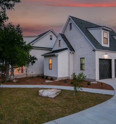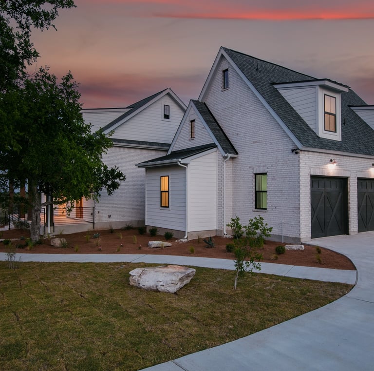 A freshly painted home exterior in warm tones that blends beautifully with the natural Hill Country landscape, enhancing curb appeal.